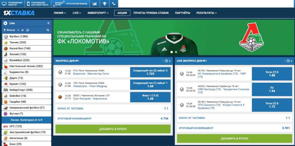 Ресурс 1xBet выполнен с учетом основного направления — букмекерских предложений. Каждый заметит минимальное количество рекламных слайдеров, поэтому взгляд сразу притягивают главные разделы: